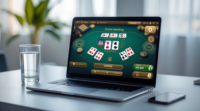 Seorang pria menggunakan laptop di meja kerja dengan layar menampilkan permainan kartu online, dikelilingi ponsel dan gelas air.
