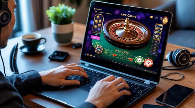 Seseorang bermain permainan kasino langsung secara online menggunakan komputer di ruang kerja yang nyaman.