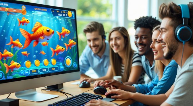 Beberapa orang muda sedang bermain permainan menembak ikan mas online di depan komputer dengan layar berwarna-warni dan ekspresi antusias.