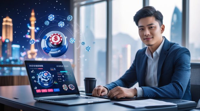 Seorang dewasa muda duduk di meja dengan laptop dan ponsel, tampak fokus belajar tentang judi online dengan latar belakang kota Macau dan simbol kasino.