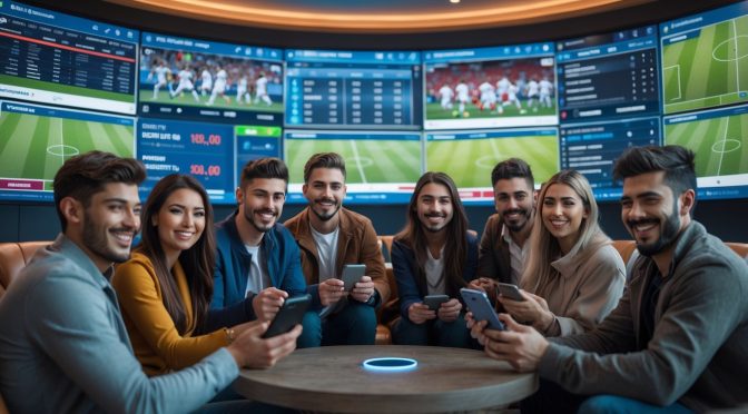 Sekelompok orang muda sedang menikmati pertandingan sepak bola secara online di sebuah ruang modern dengan layar besar dan perangkat digital.