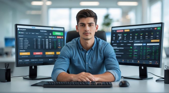 Seorang pria muda duduk di meja dengan beberapa monitor komputer yang menampilkan acara olahraga dan data taruhan, di kantor modern dengan peralatan teknologi di latar belakang.