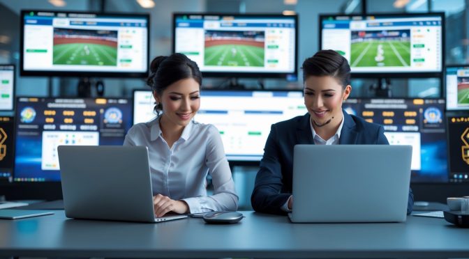 Dua orang dewasa muda sedang menggunakan komputer dengan tampilan pertandingan olahraga dan peluang taruhan di layar, di ruang kerja yang rapi dan modern.